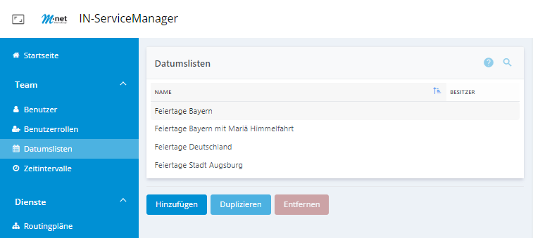 In einer Datumsliste lassen sich mehrere Tage zusammenfassen, an denen zum Beispiel eine abweichende Begrüßungsansage verwendet werden soll oder andere datumsabhängige Ereignisse im Routing definiert werden sollen.
