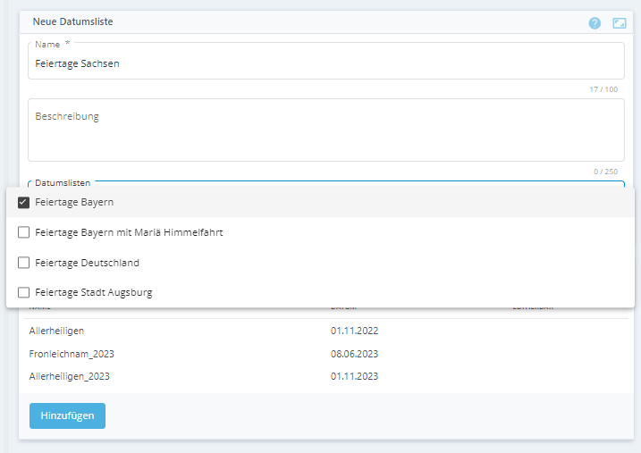 Vergeben sie einen Namen für ihre Datumsliste, z.B.: „Feiertage Sachsen“. Wenn Sie im drop-down Menü eine der bestehenden Listen auswählen, werden die Einträge aus dieser Liste in ihre Liste übernommen.