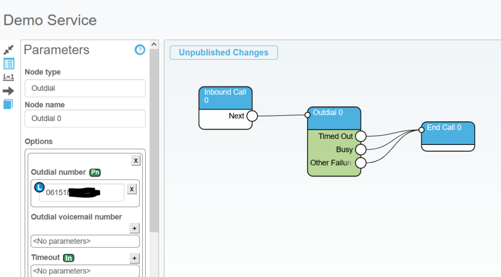 Der Routingplan soll als nächstes auf die Zielrufnummer vermitteln, also verbinden wir den Ausgang des „Inbound Call“- Nodes mit dem „Outdial“-Node.