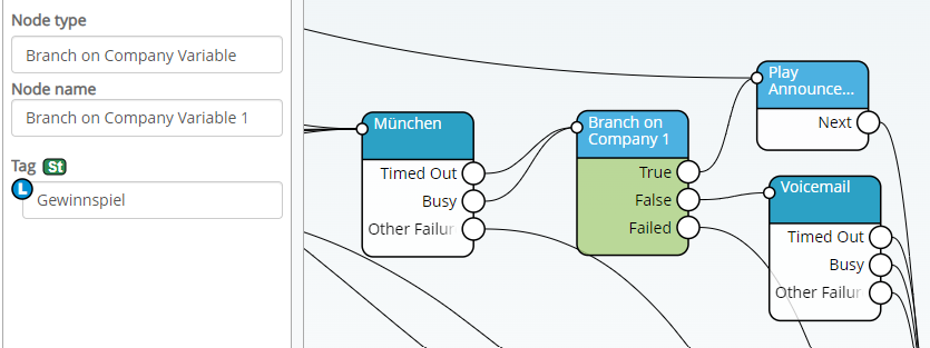 Die Variable wird mit Hilfe der Node „Branch on Company Variable“ im Routingplan verwendet. Da die identisch konfigurierte Node in mehreren Routingplänen parallel eingesetzt werden kann, erlaubt es die Funktion auch zeitgleich mehrere Dienste zu steuern.