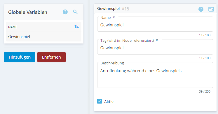 Auf der linken Menüseite sind alle bereits angelegten Variablen aufgeführt. Die Details zu der ausgewählten Variablen werden auf der rechten Menüseite angezeigt.
