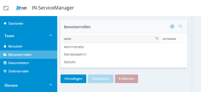 Um Benutzerrollen zu verwalten, klicken Sie in der Menüleiste auf Team > Benutzerrollen.