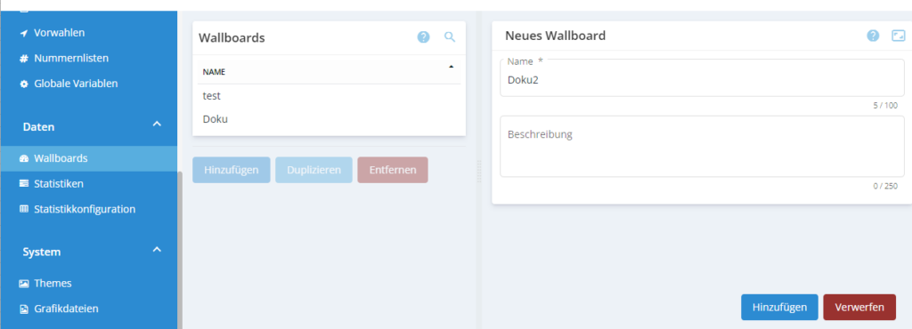 Um eine neue Wallboard hinzuzufügen klicken Sie links auf „Hinzufügen“.