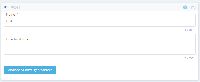 | Beschreibung | Geben Sie eine kurze Beschreibung der Wallboard (bis zu 250 Zeichen) ein. Alle Unicode-Zeichen sind zulässig, einschließlich Leerzeichen und Buchstaben mit Akzenten. |