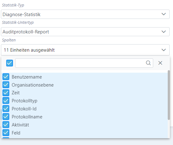 Zur Erstellung wählen Sie den Statistik-Typ „Diagnose-Statistik“ und den Statistik.Untertyp „Auditprotokoll-Report“.