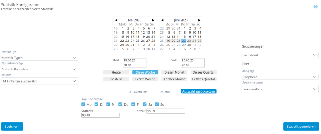 Zusätzlich können die Daten nach Mindestdauer des Gesprächs und/oder der erforderlichen Zeit für die Annahme des Gesprächs gefiltert werden.