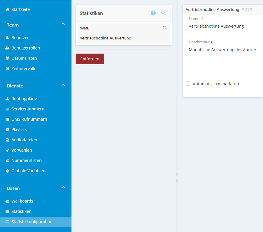 Auf der linken Menüseite sind alle bereits angelegten Statistiken aufgeführt. Die Details zu der ausgewählten Statistik werden auf der rechten Menüseite angezeigt.